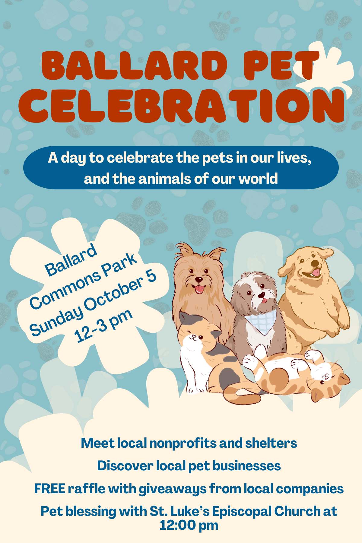 As we wrap up the Season of Creation with a celebration of St. Francis on October 5, St. Luke’s is partnering with local pet and animal-focused nonprofits to draw attention to the needs of animals in our community. Join us in Ballard Commons Park for a Ballard Pet Celebration to visit with local organizations and for a Blessing of the Animals.